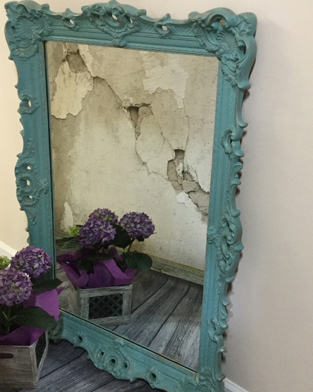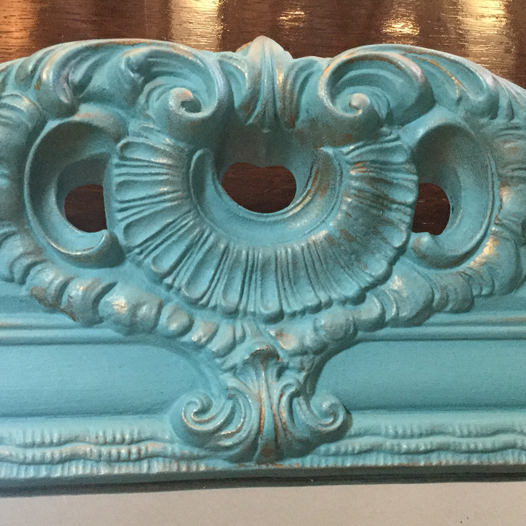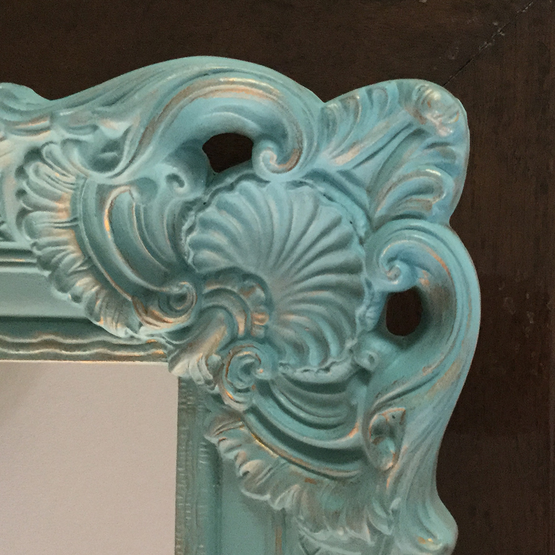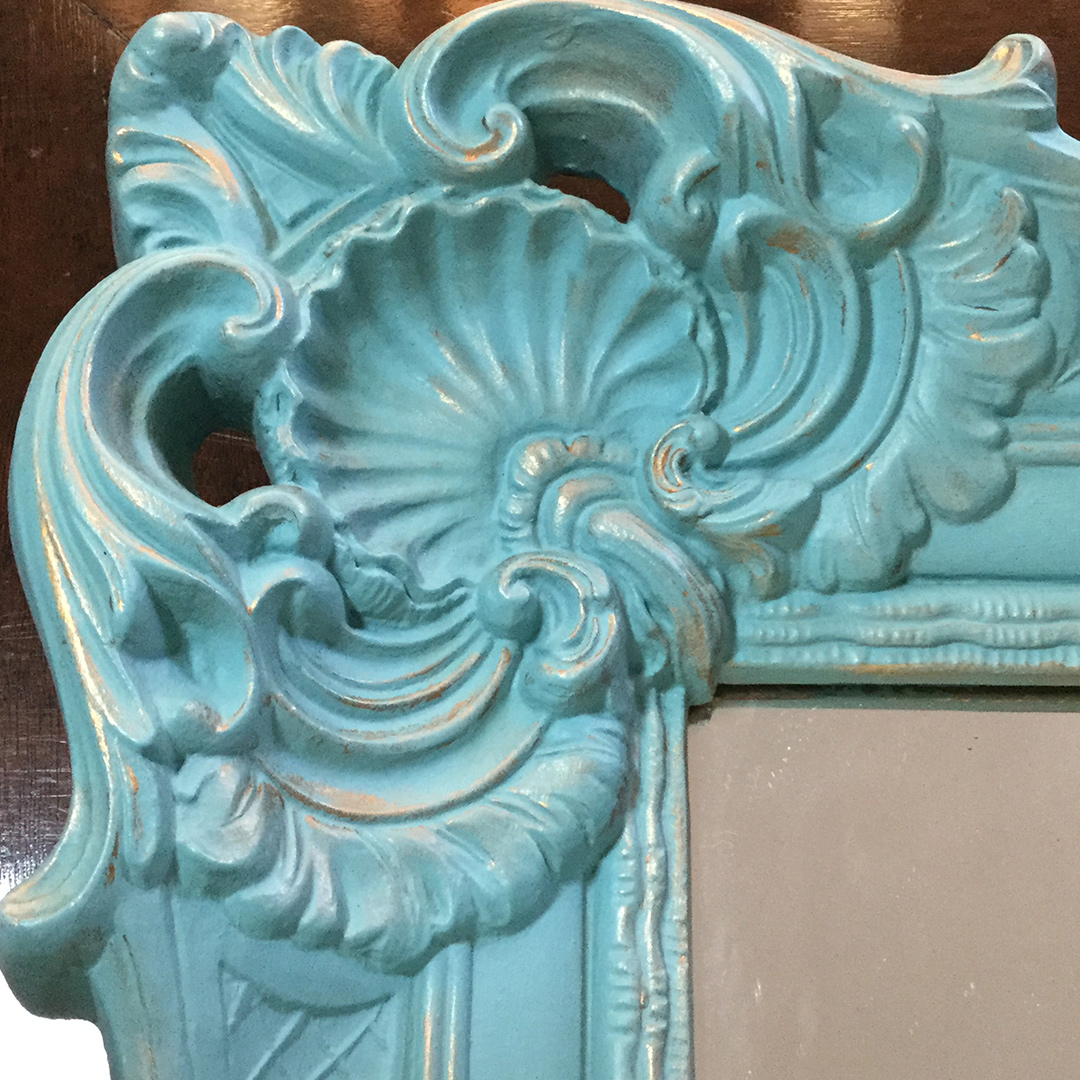 Definitely destined to be the focal point of any room. This beautiful mirror gives bright, vivacious color drama to any room. Hand painted in Annie Sloan’s Provence, a Mediterranean inspired blue. Finishing touches with gold gilding wax for added sophistication. Sealed with clear wax. Can be hung vertically or horizontally.